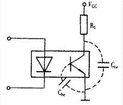 由于光耦自身存在的分布電容,對(duì)傳輸速度造成影響,光敏三極管內(nèi)部存在著分布電容Cbe和Cce,如圖4所示。由于光耦的電流傳輸比較低,其集電極負(fù)載電阻不能太小,否則輸出電壓的擺幅就受到了限制。但是,負(fù)載電阻又不宜過(guò)大,負(fù)載電阻RL越大,由于分布電容的存在,光電耦合器的頻率特性就越差,傳輸延時(shí)也越長(zhǎng)。