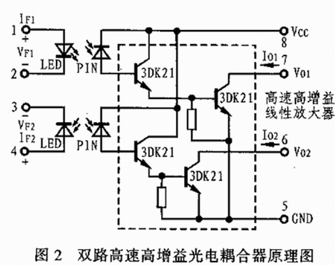 近幾年來,國內(nèi)有關(guān)單位投入大量人力物力也研究和開發(fā)了各種光電耦合器件。如上海半導(dǎo)體器件八廠、上海無線電十七廠等。而重慶光電技術(shù)研究所為了適應(yīng)市場需要研制出了一種由高速響應(yīng)發(fā)光器件和邏輯輸出型光接收放大器組成的厚膜集成雙路高速高增益電耦合器。這種光電耦合器的輸入端由兩只GaAIAs側(cè)面發(fā)光管組成,其輸出端由兩只Si—PIN光電探測器以及兩個高速高增益線性放大電路組成。圖2所示為其原理電路圖,除此之外,重慶光電技術(shù)研究所還研制出了高速高壓光電耦合器、GG2150I型射頻信號光電耦合器、GG2060I型高壓脈沖測量光電耦合器、GH1204U型高壓光傳輸光電耦合器以及 GH1201Y型和GOHQ-I型光電耦合器等。