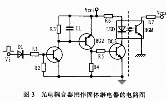 采用光電耦合器作固體繼電器具有體積小、耦合密切、驅(qū)動功率小、動作速度快、工作溫度范圍寬等優(yōu)點。圖3所示是一個光電耦合器用作固體繼電器的實際電路圖,它的左半部分電路可用于將輸入的電信號Vi變成光電耦合器內(nèi)發(fā)光二極管發(fā)光的光信號;而右半部分電路則通過光電耦合器內(nèi)的光敏三極管再將光信號還原成電信號,所以這是一種非常好的電光與光電聯(lián)合轉(zhuǎn)換器件。圖中所用的光電耦合器的電流傳輸比為20%,耐壓為150V,驅(qū)動電流在8~20mA之間。在實際使用中,由于它沒有一般電磁繼電器常見的實際接點,因此不存在接觸不良和燃弧打火等現(xiàn)象,也不會因受外力或機械沖擊而引起誤動作。所以,它的性能比較可靠,工作十分穩(wěn)定。