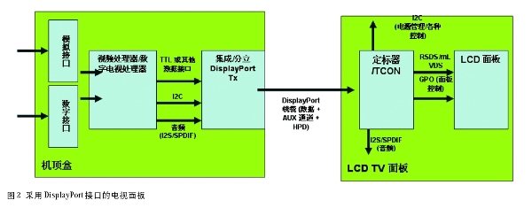 如圖2所示,DisplayPort還可以實(shí)現(xiàn)電視面板的直驅(qū),使得定標(biāo)器或視頻處理器集成到計(jì)時控制器(timing controller-TCON)中或者直接放入機(jī)頂盒中。DisplayPort 還是一個具有專用雙向命令通道(AUX)的智能顯示器接口。AUX的優(yōu)勢遠(yuǎn)不止這些,因?yàn)樗蓪?shí)現(xiàn)電視設(shè)計(jì)范例的變換,可以取代現(xiàn)有的速度較慢的命令接口,如I2C,并實(shí)現(xiàn)系統(tǒng)軟件和顯示信號間更好的一致性,這將有助于這些設(shè)備的大數(shù)據(jù)量的圖像處理。AUX 通道還便于電視系統(tǒng)設(shè)計(jì)階段的調(diào)試。該機(jī)頂盒上的處理器可以編程,以運(yùn)行預(yù)設(shè)調(diào)試或測試軟件,實(shí)現(xiàn)運(yùn)行時間檢查或錯誤狀態(tài)恢復(fù)。