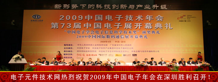 4月9日,“2009年中國電子技術(shù)年會”與“第73屆中國電子展暨2009中國國際數(shù)碼通信展”開幕式同時在會展中心隆重召開。本屆年會由工業(yè)和信息化部、深圳市人民政府指導(dǎo),中國電子學(xué)會、中國電子信息產(chǎn)業(yè)集團(tuán)中國電子器材總公司主辦,電子元件技術(shù)網(wǎng)(www.crcgulf.com)是活動特別支持網(wǎng)站,年會以“新形勢下的科技創(chuàng)新與產(chǎn)業(yè)升級”為主題。原信息產(chǎn)業(yè)部部長、中國電子學(xué)會理事長吳基傳,工業(yè)和信息化部副部長婁勤儉,工業(yè)和信息化部有關(guān)司局領(lǐng)導(dǎo),深圳市、中國電子信息產(chǎn)業(yè)集團(tuán)公司有關(guān)領(lǐng)導(dǎo)及多位院士、專家出席了會議。
