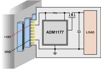 考慮一個(gè)具有12 V背板及一組可移除模塊的系統(tǒng)。每個(gè)模塊必須能在不影響任意相鄰模塊正常工作的條件下被移除和替換。當(dāng)沒(méi)有控制器時(shí),每個(gè)模塊可能會(huì)對(duì)電源線造成較大的負(fù)載電容,通常在毫法量級(jí)。首次插入一個(gè)模塊時(shí),其未充電的電容需要所有可用的電流來(lái)對(duì)其進(jìn)行充電。如果不對(duì)這個(gè)浪涌電流加以限制,這個(gè)很大的初始電流將會(huì)降低端電壓,導(dǎo)致主背板上的電壓大幅下降,使系統(tǒng)中的多個(gè)鄰近模塊復(fù)位,并破壞模塊的連接器。