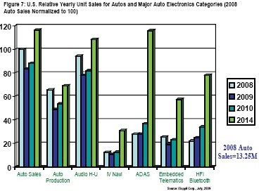 美國(guó)汽車生產(chǎn)遠(yuǎn)遠(yuǎn)落后于銷售,因?yàn)樵诿绹?guó)銷售的客車有很大一部分是在加拿大、墨西哥、歐洲和亞洲生產(chǎn)的。該圖還顯示汽車音響本體、車載導(dǎo)航、ADAS、嵌入遠(yuǎn)程信息通訊和藍(lán)牙免提接口(HFI)電子的相對(duì)銷售情況。每個(gè)類別的銷售情況相近,都是在2009年下降,隨后幾年增長(zhǎng)。只有藍(lán)牙HFI系統(tǒng)的銷售將在2009年上升,因?yàn)镕ord Sync和類似系統(tǒng)取得了成功。