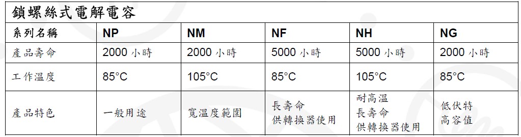 全新推出的工業(yè)級超長效鎖螺絲式電解電容系列包括NP、NM、NF、NH、NG 等五個系列,分別鎖定一般用途、寬溫度范圍、長效轉(zhuǎn)換器、高溫環(huán)境轉(zhuǎn)換器以及低電壓大容值等應(yīng)用。工作溫度范圍涵蓋85°C 至105°C;使用壽命時效,則一舉提升至2000 到5000 小時。與其他同類型產(chǎn)品相比,具備難以匹敵的寬溫度范圍及長時效特性。
