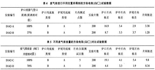 從表4可看出,廢氣排放口離恒溫區(qū)越遠,即離爐口越近,爐口的方阻片內(nèi)/片間均勻性改善越好,但廢氣排放的同時也有大量熱能的排放,在排放口區(qū)域聚集的熱能較多,因考慮到爐門的低溫(一般為小于200℃)要求,在一定程度上又限制了排放口到爐門的距離不能太近。所以,生產(chǎn)中廢氣排放口的較佳位置是在一個兩向平衡距離范圍內(nèi)。