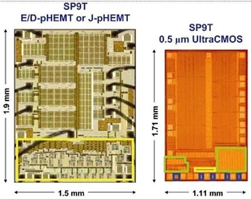 隨著多頻段手機越來越流行,對高整合度、小型天線開關(guān)的需求也越來越迫切。UltraCMOSSP7T開關(guān)現(xiàn)在已經(jīng)開始量產(chǎn),SP9T也在2007年底投入量產(chǎn)。在外形方面,GaAsSP7T為1.6x1.5mm,而采用0.5umSOS制程、具有相等或較小和較大信號性能的相似SP7T開關(guān)設(shè)計只有1.2x1.0mm,面積縮小了一半。目前已經(jīng)可用的GaAsE/DpHemt或J-pHemtSP9T開關(guān)外形尺寸為1.9x1.5mm。與之相較,采用UltraCMOS0.5um制程制造的SP9T外形尺寸為1.7x1.1mm(圖3),它不需要外部ESD元件和性能增強匹配元件。依照UltraCMOS發(fā)展規(guī)劃,0.25um版本的SP9T尺寸將達(dá)到1.32x1.29mm。