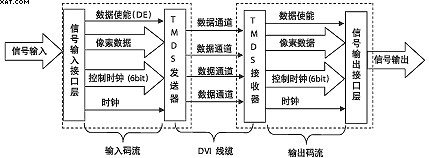 DVI是基于TMDS(TransitionMinimizedDifferentialSignaling,轉(zhuǎn)換最小差分信號)技術(shù)來傳輸數(shù)字信號,TMDS運用先進(jìn)的編碼算法把8bit數(shù)據(jù)(R、G、B中的每路基色信號)通過最小轉(zhuǎn)換編碼為10bit數(shù)據(jù)(包含行場同步信息、時鐘信息、數(shù)據(jù)DE、糾錯等),經(jīng)過DC平衡后,采用差分信號傳輸數(shù)據(jù),它和LVDS、TTL相比有較好的電磁兼容性能,可以用低成本的專用電纜實現(xiàn)長距離、高質(zhì)量的數(shù)字信號傳輸。TMDS技術(shù)的連接傳輸結(jié)構(gòu)如圖1所示。