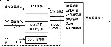 由原理圖看,數(shù)字電視增加DVI接口比較簡單,從硬件電路考慮,一是在接口處增加DVI解碼部分,二是在后端提供一個數(shù)據(jù)通道,如果電視原有方案中具有A/D轉(zhuǎn)換和相應(yīng)的后級數(shù)據(jù)處理通道,那么DVI接口解碼輸出的數(shù)據(jù)可以與它共用,因為在數(shù)字信號格式一定的情況下,其碼率、行頻、場頻、時鐘是一致的。