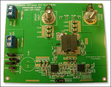 圖2所示原型設(shè)計(jì)電路板采用MAX8686,轉(zhuǎn)換器工作在400kHz;輸入電壓為12V、輸出電壓為1.2V,最大額定電流為50A。+70°C、200 LFM空氣流通條件下,轉(zhuǎn)換器能夠提供高達(dá)40A的電流。