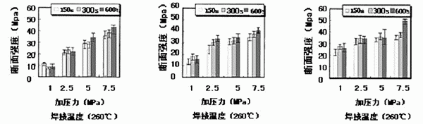 圖9顯示了焊接溫度、焊接時(shí)間、加壓等焊接參數(shù)對銀納米粒子銅觸點(diǎn)斷面強(qiáng)度的影響。從圖可得,焊接溫度和加壓是影響斷面強(qiáng)度的關(guān)鍵參數(shù)。在焊接溫度方面,強(qiáng)度隨著加壓增大而上升,但在焊接溫度高的情況下,加壓的影響會變小。另外就焊接溫度而言,加壓低的情況下,焊接溫度對強(qiáng)度影響大,而加壓增高時(shí)則焊接溫度的影響變小。所以,在260℃左右的溫度下加大壓力,而盡可能在低加壓場合提高連接溫度,這樣做才最有效。