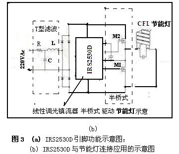 IRS2530D和IRS2158D為600V控制IC。IRS2530DDIM8是一種采用緊湊型8管腳尺寸半橋式驅(qū)動(dòng)器的線性調(diào)光鎮(zhèn)流器控制IC。它只需要幾個(gè)小型外部元件,顯著地簡化和縮小了電路設(shè)計(jì),同時(shí)可實(shí)現(xiàn)10%的調(diào)光系統(tǒng)性能。圖3(a)為引腳功能示意圖。[page]