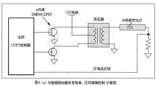 之所以考慮推挽驅(qū)動(dòng)器,因它有很多好處。這種架構(gòu)只用到n溝道MOSFET(見圖6(a)所示),這有利于降低成本和增加逆變器效率。它很容易適應(yīng)較高的逆變器直流電源電壓。采用更高的逆變器直流電源電壓時(shí),只需選擇具有合適的漏-源擊穿電壓的MOSFET即可。不管逆變器的直流電源電壓如何,都可采用同樣的CCFL控制器。但采用n溝道MOSFET的全橋和半橋架構(gòu)就無法做到這一點(diǎn)。對(duì)于LCD電視非常理想,因?yàn)殡娨曋械哪孀兤髦绷麟娫措妷和ǔ?huì)被穩(wěn)定在±20%。