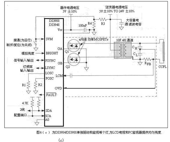 圖6(c)為用DS3984(4通道)和DS3988(8通道)CCFL控制器既解決了本文所提到的所有這些設(shè)計(jì)挑戰(zhàn)??蓪⑦@些器件配置為每個(gè)通道驅(qū)動(dòng)一個(gè)燈,或者每通道多個(gè)燈,用戶可靈活裁減設(shè)計(jì),以滿足自己的性價(jià)比目標(biāo)。多個(gè)DS3984/DS3988可輕松級(jí)聯(lián),以支持任意數(shù)量的燈,來為LCD電視屏提供背光照明。