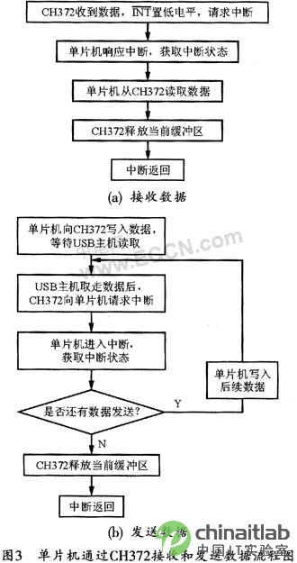 CH372芯片專門用于處理USB通訊。在接收到數(shù)據(jù)或發(fā)送完數(shù)據(jù)后,CH372將以中斷方式通知單片機(jī)進(jìn)行處理。單片機(jī)通過CH372接收和發(fā)送數(shù)據(jù)的流程圖如圖3所示。
