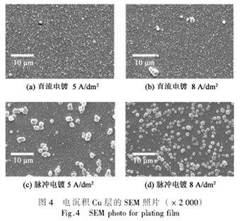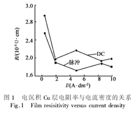 圖1是電沉積Cu層電阻率與電流密度之間的關(guān)系??梢?jiàn),脈沖電鍍得到的Cu鍍層電阻率小于相同電流密度下的直流鍍層。在小電流密度時(shí)(<2A/dm2),直流鍍層和脈沖鍍層的電阻率都較大。
