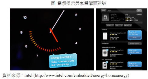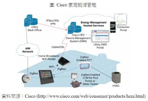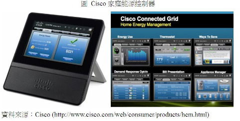 在綠色節(jié)能觀念的日益普及趨勢(shì)下,有效管理家中用電的家庭能源管理(Home Energy Management,HEM)成為智慧電網(wǎng)公共建設(shè)外,另一項(xiàng)具備高度發(fā)展?jié)摿Φ氖袌?chǎng)領(lǐng)域。面對(duì)民眾對(duì)節(jié)能管理的需求,現(xiàn)階段陸續(xù)已有許多國(guó)際大廠(chǎng)投入相關(guān)應(yīng)用與服務(wù)的研發(fā);除了Google推出PowerMeter的用電監(jiān)測(cè)網(wǎng)路平臺(tái)外(需搭配智慧電表或插座等設(shè)備),Cisco與Intel也陸續(xù)搭上平板電腦熱潮,推出協(xié)助民眾管理家庭用電的HEM裝置。相較于Google PowerMeter,Cisco與Intel所推出產(chǎn)品是以物聯(lián)網(wǎng)(Internet of Things,IoT)概念為基礎(chǔ),透過(guò)無(wú)線(xiàn)網(wǎng)路模式連結(jié)家中各項(xiàng)電器設(shè)備,進(jìn)行用電資訊的傳遞與監(jiān)控,同時(shí)進(jìn)行遠(yuǎn)端遙控動(dòng)作。 Cisco推出包含家庭能源控制器(Home Energy Controller,HEC)與能源管理服務(wù)平臺(tái)的家庭能源管理解決方案(Home Energy Management Solution,HEMS),作為進(jìn)入家庭節(jié)能市場(chǎng)的第一步。 HEC如同家庭中的監(jiān)控中心,除了可以在螢?zāi)簧霞磿r(shí)顯示家中用電的即時(shí)狀態(tài)資訊外,使用者透過(guò)觸控面板的HEC還可以對(duì)連線(xiàn)的家電產(chǎn)品進(jìn)行操控,決定是否關(guān)閉或調(diào)整特定家電來(lái)節(jié)省電力消耗。