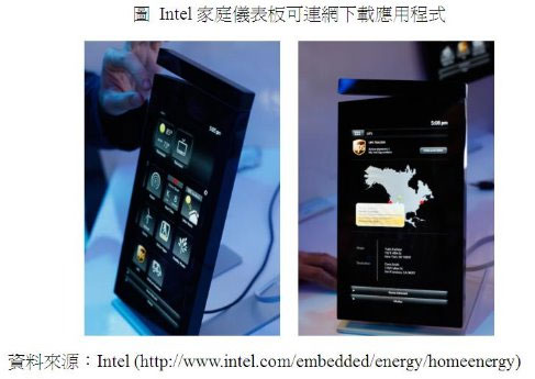 在家庭能源管理的概念下,Intel也推出暫稱(chēng)為「家庭儀表板(Home Dashboard)」的整合性解決方案,產(chǎn)品設(shè)計(jì)為一個(gè)具備運(yùn)算能力且低耗能的平板電腦。 Intel規(guī)劃此產(chǎn)品成為家庭網(wǎng)路的核心(Heart of the Home Network),使用者可與智慧家電、智慧插座、智慧電表與家中各項(xiàng)感測(cè)裝置進(jìn)行連結(jié)與監(jiān)控動(dòng)作,并進(jìn)行家電設(shè)備的安全設(shè)定、溫控設(shè)定、電源