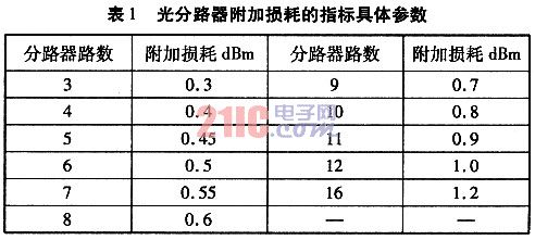 設(shè)各路的總光功率為∑Pn,某一路所需的光功率為P1,則分光比K1=P1/∑Pn,需要強(qiáng)調(diào)的是,某一支路所需的光功率為該支路光纖鏈路損失功率加上光接收機(jī)輸入光功率。