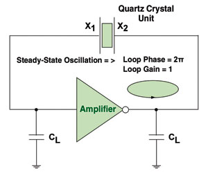 如果皮爾斯拓?fù)浣Y(jié)構(gòu)的非線性增益大于某個(gè)最小值,而且非線性延時(shí)提供了滿足接近石英晶體單元串聯(lián)諧振頻率相移條件的足夠相移,它就可以很好地使振蕩頻率接近石英晶體串聯(lián)諧振頻率而使振蕩器進(jìn)入穩(wěn)態(tài)。如果振蕩能夠滿足這些條件,當(dāng)放大器延遲改變時(shí),輸入/輸出放大器的波形幅值包跡將隨著時(shí)間增加,直到穩(wěn)態(tài)振蕩條件得到滿足。在許多情況下,當(dāng)峰峰值輸出幅值達(dá)到供電電壓和地之間的差值時(shí),放大器增益就可以達(dá)到一個(gè)基本不變的穩(wěn)態(tài)值。