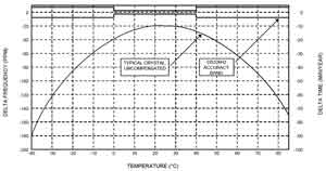 圖2補(bǔ)償和未補(bǔ)償晶體振蕩器的頻率與溫度關(guān)系曲線