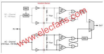 高速信號由AC通道來處理,信號在通道中首先從單端模式轉(zhuǎn)換為差分模式,然后被隔離層的電容-電阻網(wǎng)絡差分為許多瞬態(tài)。后面的比較器再將這些瞬態(tài)轉(zhuǎn)換為差分脈沖,從而設(shè)置和重置一個“或非”門觸發(fā)器。相當于原始輸入信號的觸發(fā)器輸出饋至判定邏輯(DCL)和輸出多路復用器。DCL包括一個看門狗定時器,該定時器用于測量信號轉(zhuǎn)換之間的持續(xù)時間。如果兩個連續(xù)轉(zhuǎn)換之間的持續(xù)時間超出定時窗口(如低頻信號的情況下),則DCL則指示輸出多路復用器從AC-通道切換到DC-通道。
