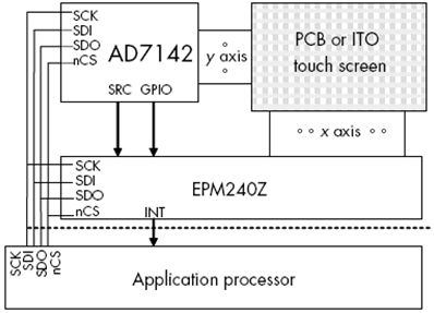 AD7142 CDC可以測(cè)量14個(gè)傳感器相對(duì)于一條SRC走線的電容。增加MAX IIZ CPLD后,可在串行接口的控制下,獲得AD7142 CDC的SRC方波信號(hào),并選擇驅(qū)動(dòng)觸摸屏的某一條垂直x走線,從而支持多條SRC走線。AD7142 CDC可以進(jìn)行相對(duì)于垂直走線軸或者本地的電容測(cè)量。MAX IIZ中大量的I/O (5x5mm封裝支持54個(gè)I/O,7x7mm封裝支持116個(gè)I/O)結(jié)合AD7142的高分辨率電容數(shù)字測(cè)量能力,使這一解決方案能夠適用于面積較大的觸摸屏和面板。