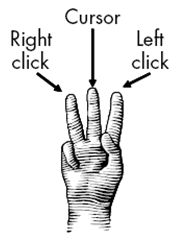 圖1(b)中的傳感器可實(shí)現(xiàn)計(jì)算導(dǎo)航板,從而避免了使用普通導(dǎo)航板所需要的選擇按鈕。如圖2所示,中指移動(dòng)光標(biāo),食指和無名指觸摸屏幕,指示鼠標(biāo)左鍵或者右鍵點(diǎn)擊。去掉移動(dòng)部分后,電容觸摸屏傳感器比按鍵和按鍵開關(guān)更耐用。