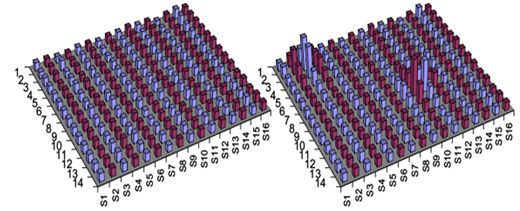 圖4為AD7142 CDC和MAX IIZ CPLD相結(jié)合后的2D電容測(cè)量結(jié)果,顯示了16條走線,即,對(duì)x軸進(jìn)行了16次劃分。左側(cè)是基線電容測(cè)量,而右側(cè)是兩個(gè)手指觸摸傳感器后的結(jié)果。圖中藍(lán)色和紅色采樣行表示哪一SRC走線被激活。