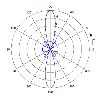 圖2.五單元天線矩陣(單元間相差為零)產(chǎn)生的輻射圖,天線位于原點,沿x軸以半波長為間距。[page]