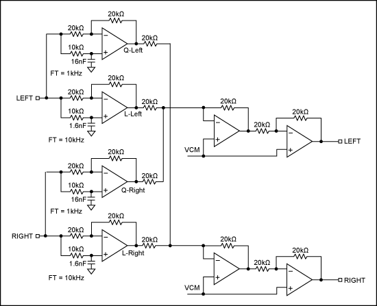 無源方案可以實現(xiàn)該電路,但是更通用的方法是有源電路(圖7)。對于線性信號(相應(yīng)的輸入通道),電路呈現(xiàn)為一個ft=10kHz的相移濾波器,對于積分信號(另一路輸入),電路呈現(xiàn)為一個ft=1kHz的相移濾波器。目的是使線性輸入信號和積分信號之間在音頻帶寬1kHz至10kHz范圍內(nèi)呈現(xiàn)90°相移。