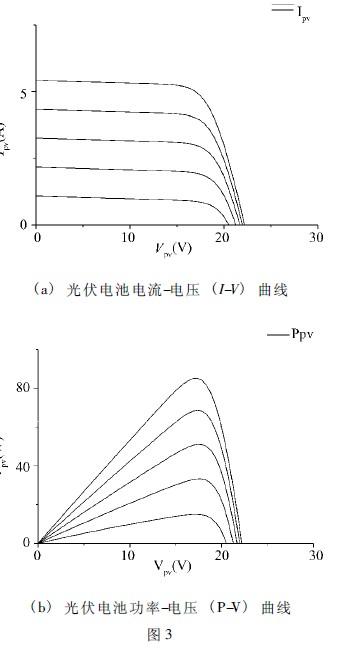 圖3a為光伏電池在不同光照下的電流-電壓(I-V)曲線,圖3b為光伏電池在不同光照下功率-電壓(P-V)曲線。如圖3.b所示,在一定的光照情況和節(jié)點(diǎn)溫度下,光伏電池有唯一的發(fā)電最大功率點(diǎn),因此需要光伏控制器進(jìn)行最大功率跟蹤(MPPT)控制以獲得最大發(fā)電效率。