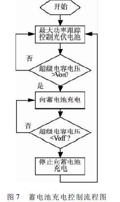 圖7為蓄電池充電控制策略。該策略在低光照情況下采用超級(jí)電容電壓的滯環(huán)比較控制策略,以超級(jí)電容兩端電壓作為反饋采樣信號(hào)。若超級(jí)電容兩端電壓低于設(shè)定下限值Voff,則停止向蓄電池充電,光伏控制器采用最大功率跟蹤對(duì)超級(jí)電容充電;當(dāng)超級(jí)電容電壓充到足夠大為Von時(shí)(Von>Voff),以蓄電池的三段式10小時(shí)充電法向蓄電池充電;若此時(shí)持續(xù)低光照,則當(dāng)超級(jí)電容電壓重新下降到下限值Voff時(shí),再次停止向蓄電池充電,如此循環(huán);在足夠光照情況下,當(dāng)超級(jí)電容的電壓超過(guò)Von時(shí),系統(tǒng)對(duì)蓄電池以三段式10小時(shí)充電法充電,同時(shí)超級(jí)電容電壓也會(huì)繼續(xù)上升,這時(shí)控制器保持超級(jí)電容的電壓值不超過(guò)新的上限值Vmax。