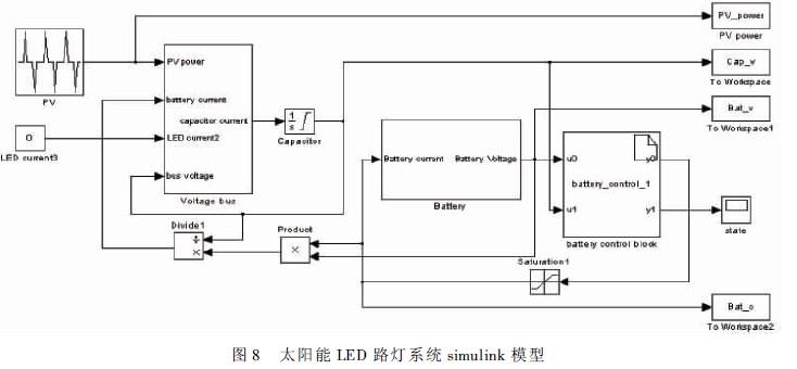 根據(jù)以上數(shù)據(jù)在仿真模型中建立simulink/matlab模型,模型按照?qǐng)D1所示的系統(tǒng)結(jié)構(gòu)建立,采用帶有最大功率跟蹤的光伏電池控制器,把光伏電池上的電能傳輸?shù)街苯硬⒙?lián)超級(jí)電容的直流母線上。同時(shí)電能通過(guò)蓄電池充放電控制器給蓄電池充電。如圖8所示,該系統(tǒng)的simulink模型主要有PV模塊、LED模塊、直流母線模塊、蓄電池模塊、超級(jí)電容積分模塊、蓄電池充電控制器模塊。