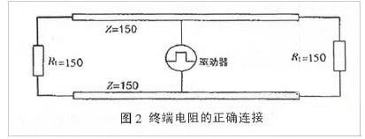 ②阻抗不連續(xù)。顧名思義,與光從一種媒質進入另一種媒質時所引起的反射是相似的。信號在傳輸線末端突然遇到電纜阻抗很小甚至沒有,信號在這個地方就會引起反射。消除這種反射最常用的方法,是在電纜的末端跨接一個與電纜的特性阻抗同樣大小的終端電阻,使電纜的阻抗連續(xù)。由于信號在電纜上的傳輸是雙向的,因此,在通訊電纜的另一端同樣要跨接一個相同大小的終端電阻,如圖2所示。