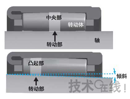(圖2·噪聲增大的機(jī)制:軸傾斜時,滾動體的滾動部從中央部向凸起部移動。凸起部的精度比中央部低,因此產(chǎn)生不穩(wěn),使得噪聲增大)