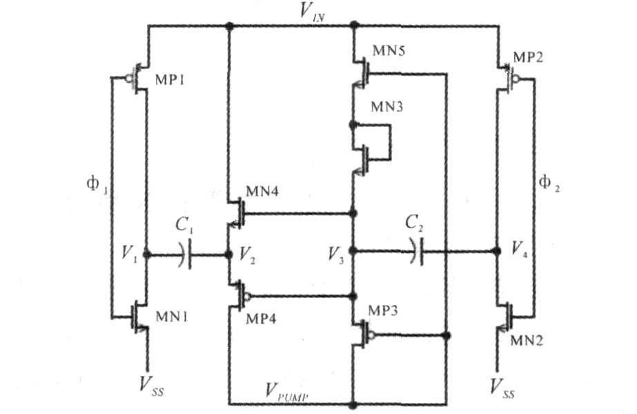 自舉電荷泵不需要為MN2和MP2提供柵驅動電壓,控制簡單,但輸出電壓會有一個閾值損失。圖3是改進后的電荷泵電路圖,1和2為互補無交疊時鐘。由MN2、MN5、MP3、MP2和電容C2組成的次電荷泵為MN4、MP4提供柵壓,以保證其完全關斷和開啟。當1為低電平時,MP1導通,電位增加,此時,V3電位為零,MP4導通,V2上的電荷轉移到柵電容CGATE上,VPUMP電位升高。當1為高電平時,MP2導通,為C2充電,V4電位上升至電源電位,V3電位隨之上升,MP3導通,VPUMP電位繼續(xù)升高。MN3相當于二極管,起單向導電的作用。