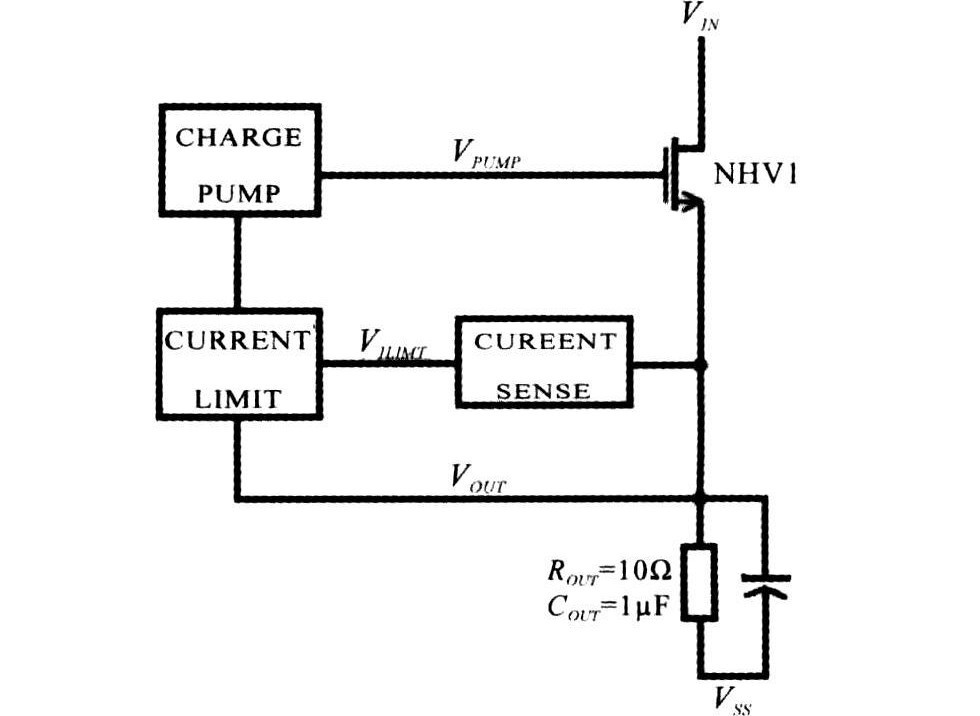 圖1為USB電源開關的整體設計。其中,VIN為電源輸入,VOUT為USB的輸出。在負載正常的情況下,由電荷泵產生足夠高的柵驅動電壓,使NHV1工作在深線性區(qū),以降低從輸入電源(VIN)到負載電壓(VOUT)的導通損耗。當功率管電流高于1A時,Currentsense輸出高電平給過流保護電路(Currentlimit);過流保護電路通過反饋負載電壓給電荷泵,調節(jié)電荷泵輸出(VPUMP),從而使功率管的工作狀態(tài)由線性區(qū)變?yōu)轱柡蛥^(qū),限制功率管電流,達到保護功率管的目的。當負載恢復正常后,Currentsense輸出低電平,電荷泵正常工作。