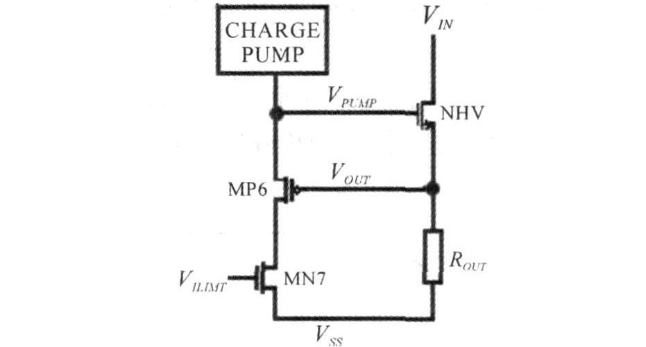 當出現過載和短路故障時,負載電流達到數安培,需要精確的限流電路為功率管和輸入電源提供保護。對于MOS器件,只有工作在飽和區(qū)時的電流容易控制。限流就是通過反饋負載電壓,調節(jié)電荷泵輸出電壓來實現的。圖4是限流電路的原理圖。