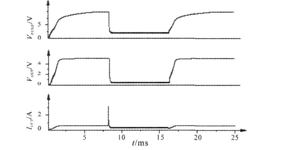 表1為限流電路工作時功率管的平均柵電壓和平均電流。圖6為USB開關啟動8ms后負載短路到恢復正常的仿真結果。USB開關在負載正常情況下啟動,8ms后負載短路,負載電流過沖到3.1A。當過流保護電路工作后,過流保護電路將電流限制在0.3A,保護了USB端口。16ms后,負載恢復正常,電源開關重新啟動。