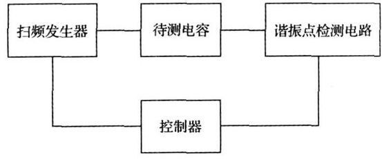 同時諧振發(fā)生時整個LC 回路表現(xiàn)出的阻抗為純阻性, 即感抗和容抗之和為零。利用這個原理, 使用一個掃頻信號激勵待測電容, 測量出諧振頻率, 再結(jié)合式(1) 即可測出寄生電感的大小 。根據(jù)該原理, 設(shè)計1 個掃頻發(fā)生器產(chǎn)生掃頻信號激勵待測電容, 然后找出諧振點, 讀出諧振頻率即可求出電容的寄生電感。其結(jié)構(gòu)如圖3 所示。