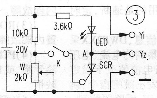 測(cè)試方法:示波器輸人耦合開關(guān)置“DC”擋,Y軸衰減開關(guān)置5V/cm。當(dāng)開關(guān)K未閉合時(shí),控制端未加控制電壓,則SCR不導(dǎo)通,回路電流幾乎為零,示波器屏上顯示的A點(diǎn)壓VA≈20V。合上開關(guān)K,調(diào)節(jié)電位器W的阻值(由小到大),直到可控硅導(dǎo)通為止,此時(shí)發(fā)光二極管LED亮,VA急劇下降(可控硅導(dǎo)通后的VA≈0.7V)。此時(shí)斷開開關(guān)K,則SCR繼續(xù)導(dǎo)通,LED仍亮,屏上顯示的電壓仍保持在0.7V左右,若要SCR截止,只有切斷電源才行。