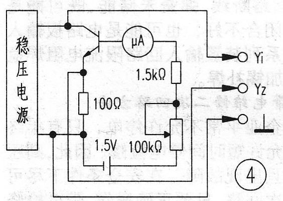 測(cè)試方法:把圖4連入示波器,從圖中可以看出:X軸通道信號(hào)反映了集電極、發(fā)射極偏置電壓的大小,Y軸通道的信號(hào)反映了該電路中三極管Ic的變化,示波器耦合開關(guān)置“DC”擋。斷開1.5V電源,Ib=0,則示波器上出現(xiàn)—條水平亮線。通入1.5V電源,調(diào)整100kΩ電位器值的大小,分別使Ib為20uA、40uA、 60uA、 80uA, 則示波器屏幕上將依次掃描出四條曲線,如圖5所示。由此可以很方便地測(cè)出該晶體管的直流放大倍數(shù),并從曲線的線性度上判別管子的優(yōu)劣程度。