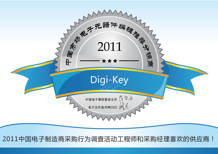 在近日剛剛結(jié)束的2011中國(guó)電子制造商采購(gòu)行為調(diào)查暨中國(guó)市場(chǎng)電子元器件領(lǐng)軍廠商的評(píng)選活動(dòng)中,Digi-key憑借廣泛的電子元器件庫(kù)存、最全面的在線資源和快速響應(yīng)客戶訂單等多方面優(yōu)勢(shì),以及在工程師心目中形成的良好形象,一舉榮獲2011中國(guó)市場(chǎng)電子元器件編輯推薦分銷商稱號(hào)!