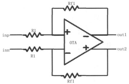 D 類(lèi)音頻功率放大器的輸入放大級(jí)是基于運(yùn)算放大器(OTA)的閉環(huán)結(jié)構(gòu)來(lái)實(shí)現(xiàn)的,其結(jié)構(gòu)如圖4所示,用來(lái)根據(jù)需要對(duì)輸入的音頻信號(hào)作電平調(diào)整和信號(hào)放大處理,使輸入信號(hào)在幅度方面能滿(mǎn)足后級(jí)電路的要求,輸入放大級(jí)的增益可以通過(guò)設(shè)置Rf1和R1 的阻值來(lái)決定。