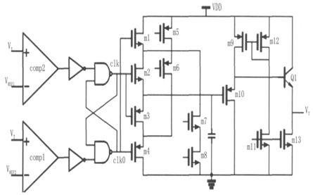 本文采用的三角波產(chǎn)生電路結(jié)構(gòu)如圖6 所示,其中m5、m6 和m7、m8 構(gòu)成了兩組恒流源,m9~m13 和Q1 構(gòu)成了輸出級(jí)。在電路中,采用將輸出信號(hào)VT 分別反饋到比較器comp1 和comp2,與參考電平VREF1 和VREF2(VREF2<VREF1)進(jìn)行比較,并通過(guò)一組數(shù)字電路產(chǎn)生兩路反向的時(shí)鐘信號(hào)clk 與clk0,來(lái)控制m2 和m3 的開(kāi)啟和關(guān)斷,從而達(dá)到對(duì)電容C 進(jìn)行充放電,產(chǎn)生三角波信號(hào)VT 的目的。