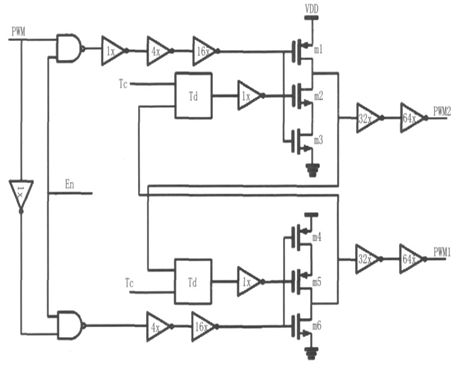 驅(qū)動(dòng)電路結(jié)構(gòu)如圖8 所示,該電路能有效調(diào)節(jié)死區(qū)時(shí)間(N 型、P 型功率開(kāi)關(guān)管同時(shí)關(guān)斷),防止單臂"shoot- through"現(xiàn)象,并有保護(hù)關(guān)斷功能。輸入信號(hào)為比較器輸出的PWM 脈沖信號(hào),PWM1用來(lái)驅(qū)動(dòng)N 型功率開(kāi)關(guān)管,PWM2 用來(lái)驅(qū)動(dòng)P 型功率開(kāi)關(guān)管。為了避免全橋開(kāi)關(guān)電路中的單臂"shoot- through"現(xiàn)象,當(dāng)PWM 信號(hào)從低電平變?yōu)楦唠娖綍r(shí),PWM2 應(yīng)首先變?yōu)楦唠娖剑?關(guān)斷PMOS 功率開(kāi)關(guān)管,隨后PWM1 再變?yōu)楦唠娖?,開(kāi)啟NMOS 功率開(kāi)關(guān)管,如圖9 所示;反之,當(dāng)PWM 信號(hào)從高變?yōu)榈蜁r(shí),PWM1 先變?yōu)榈碗娖?,關(guān)斷NMOS 開(kāi)關(guān)功率管,隨后PWM2 再變?yōu)榈碗娖?,開(kāi)啟PMOS 開(kāi)關(guān)功率管。實(shí)際電路中,可以根據(jù)需要通過(guò)控制延遲單元的控制位Tc 來(lái)調(diào)整死區(qū)時(shí)間的長(zhǎng)短。為減小失真,必須減小死區(qū)時(shí)間,該驅(qū)動(dòng)電路采用了逐級(jí)增加驅(qū)動(dòng)能力的方式來(lái)驅(qū)動(dòng)功率管,從而減小了必要的死區(qū)時(shí)間,保證了低失真度。