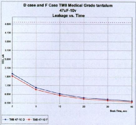 圖8是一種47uF-10V的鉭電容,雖然其最大DCL為4.7uA,根據(jù)特定的保壓時(shí)間篩選后,可為應(yīng)用提供超低DCL.以圖8的元件為例,該批量可以按照10秒鐘DCL 600nA的標(biāo)準(zhǔn)篩選,從而把總體 DCL 從 4.7uA 降至 600nA 限值。