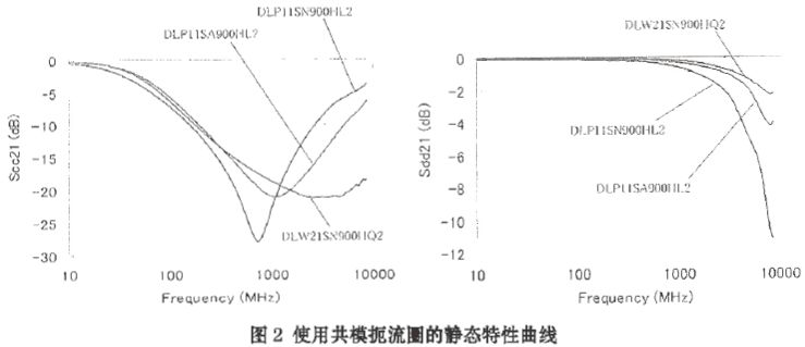 現(xiàn)在把共模扼流圈在信號線上和時鐘線上測試其噪音并因此確定受到的影響。在1080p或12位深色的最高信號頻率為1.11GHz上,對數(shù)據(jù)傳輸進行評價。圖2所示為共模轉(zhuǎn)換特性,特別是Scc21,在此消除的噪音但增加了與其成比例的Scc21的量值,以及差分模式傳輸特性和影響信號波形跌幅成比例的Sdd21。在此采用共模扼流圈進行評價。