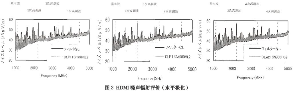 圖3所示為使用共模扼流圈后,HDMI輻射噪音的測量結(jié)果。從圖中可見,這種共模扼流圈圖可以抑制1GHz甚至更高頻率的噪音。實際上,它對高次諧波有很強的抑制效果。所有這些共模扼流圈應(yīng)用的效果來講,噪音在2.22GHz處衰減約為10db。圖中還顯示出由于使用了共模扼流圈,噪音在3.33GHz和4.44GHz時的衰減呈現(xiàn)多樣性。另外,從圖中可見,DLP11SN900HL2的噪音抑制效果比其它型號共模扼流圈差,這是因為DLP11SN900HL2的Scc21值在3GHz及更高頻率處相對較低,如圖2所示。由圖2和圖3顯示結(jié)果可見,增加一個在30GHz及以上頻率處有10db以上衰減能力的共模扼流圈是必須的。