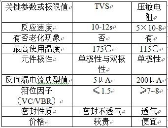 目前,國內(nèi)不少需進(jìn)行浪涌保護(hù)的設(shè)備上使用的是壓敏電阻。壓敏電阻是一種金屬化物變阻器。TVS比壓敏電阻的特性優(yōu)越得多,具體特性參數(shù)的比較如下表所示。